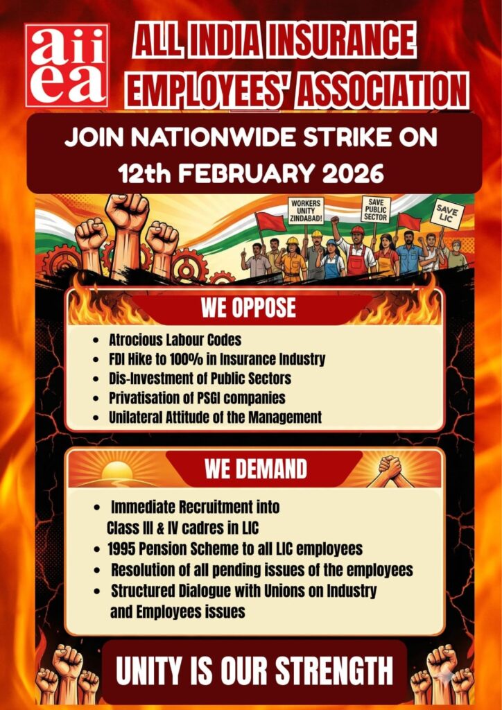 LIC कर्मचारियों से अपील है कि वे 12 फरवरी को होने वाली अखिल भारतीय आम हड़ताल में बड़ी संख्या में शामिल हों।