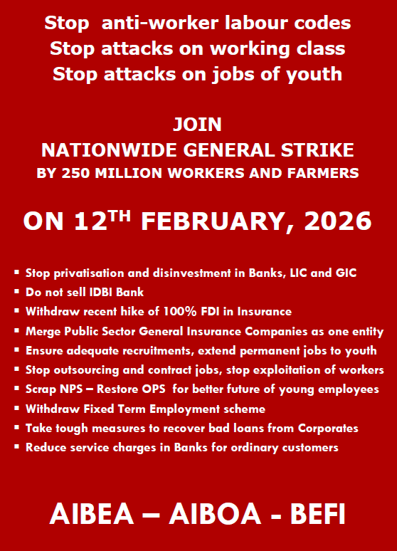 ऑल इंडिया बैंक एम्प्लॉइज़ एसोसिएशन (AIBEA), ऑल इंडिया बैंक ऑफिसर्स एसोसिएशन (AIBOA) और बैंक एम्प्लॉइज़ फेडरेशन ऑफ इंडिया (BEFI) का आह्वान (अंग्रेजी आह्वान का अनुवाद) Read more