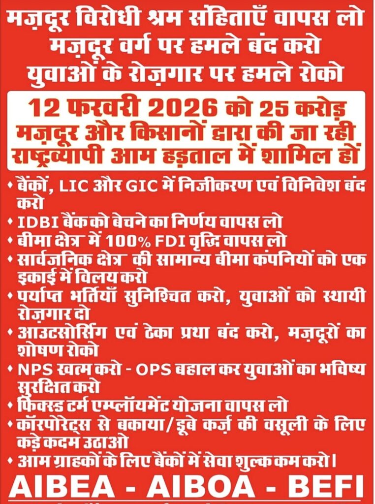 मज़दूर विरोधी श्रम नीतियों का विरोध करने के लिए मज़दूर वर्ग से जुड़ें! 12 फरवरी 2026 को अखिल भारतीय आम हड़ताल में शामिल हों!