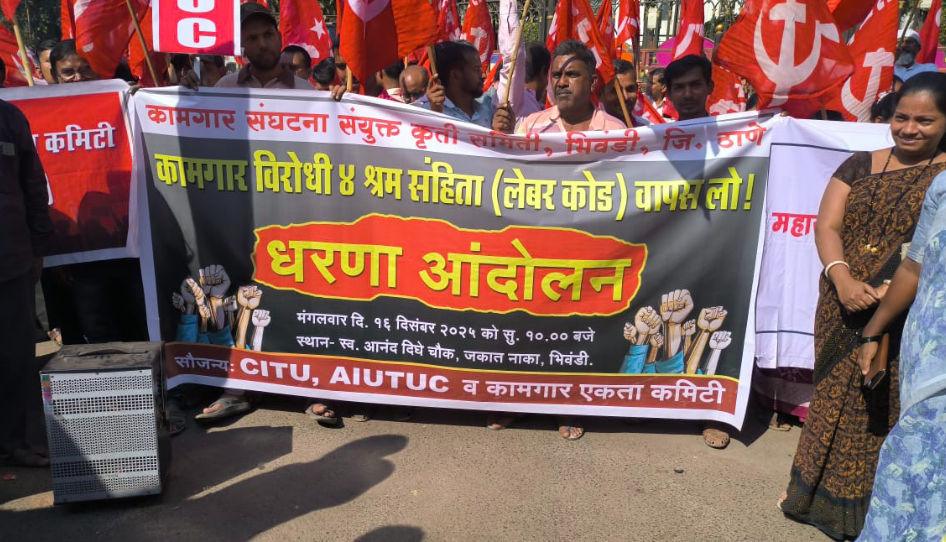 16 दिसंबर 2025 को, कामगार संगठन संयुक्त कृति समिति के बैनर तले, केंद्र सरकार द्वारा 21 नवंबर 2025 को नोटिफ़ाई किए गए चार नए लेबर कोड के ख़िलाफ़ भिवंडी में एक जोशीला प्रदर्शन किया गया। बड़ी संख्या में पुरुष और महिला मज़दूर भिवंडी में तहसीलदार के ऑफ़िस के सामने इकट्ठा हुए और उन्होंने चार लेबर कोड (श्रम संहिताएँ) का विरोध किया।