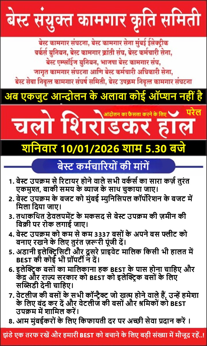 मुंबई की BEST बसों के कर्मचारी BEST प्रॉपर्टी की बिक्री के खिलाफ और लंबे समय से बकाया पेमेंट और अन्य मांगों के लिए एकजुट हुए