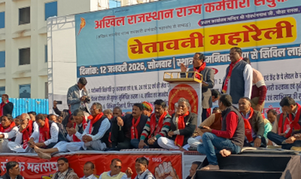 राजस्थान की राजधानी जयपुर में 12 जनवरी, 2026 को हज़ारों की संख्या में, 88 विभागों के सरकारी कर्मचारियों ने चेतावनी रैली में भाग लिया। इनमें शिक्षक, स्कीम वर्कर, हेल्थ वर्कर, वन विभाग कर्मी, स्टेनोग्राफर, कृषि मित्र शामिल थे। राजस्थान नर्सिंग महासंघ, राजस्थान शारीरिक शिक्षा शिक्षक संघ, राजस्थान पंचायत शिक्षक संघ, कुक कम हैल्पर संघर्ष समिति-राजस्थान, राजस्थान अधीन सांख्यिकी कर्मचारी संघ, एल.एच.वी.-ए.एन.एम. संघ ऑफ़ राजस्थान, राजस्थान आवासन बोर्ड कर्मचारी संघ, राजस्थान पटवार संघ, राजस्थान क़ानूनगो संघ, राजस्थान शिक्षक संघ (प्रगतिशील), इनके अलावा कई और संगठनों के कर्मियों ने हिस्सा लिया।