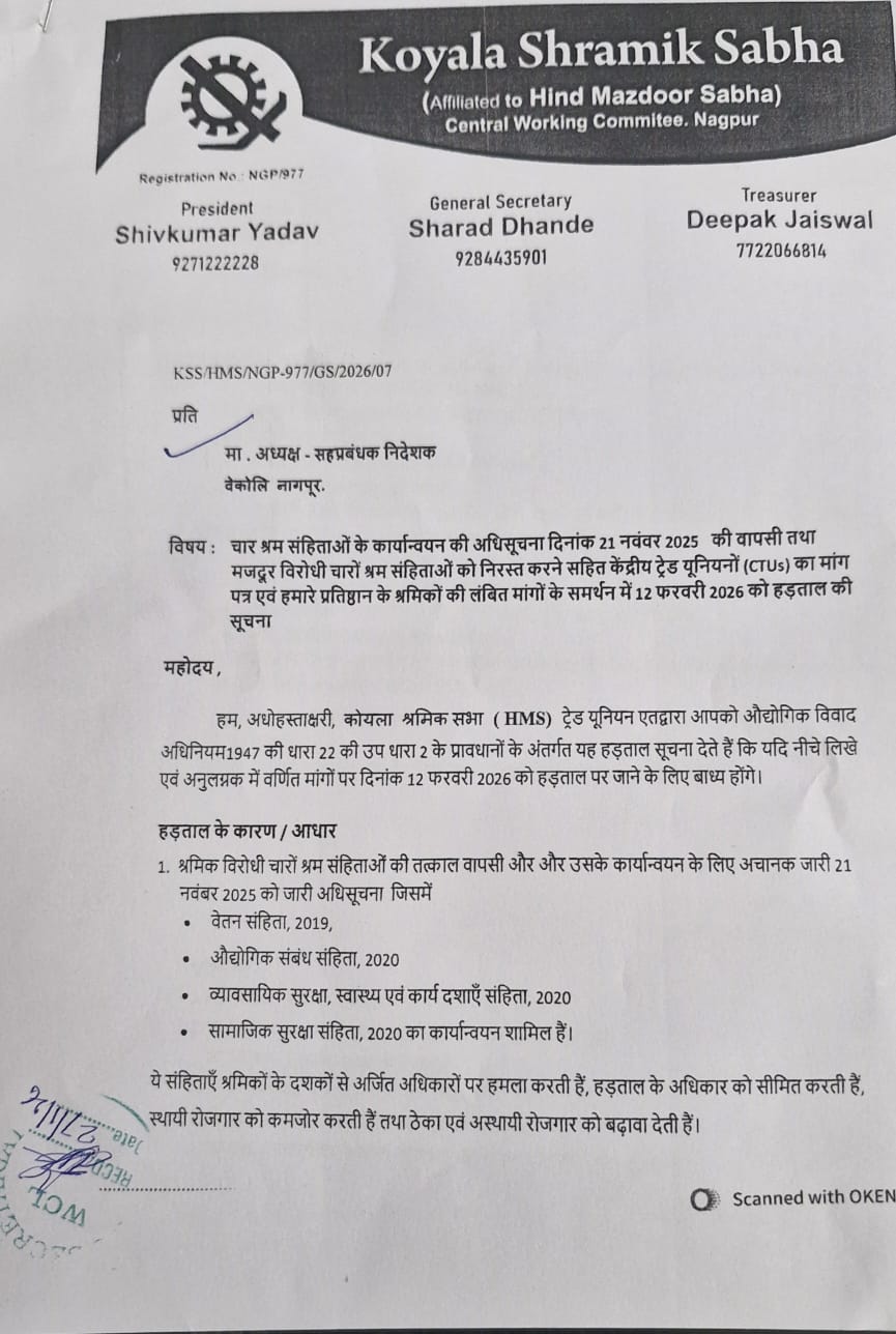 काफी बड़ी संख्या में सार्वजनिक क्षेत्र के कर्मचारियों का प्रतिनिधित्व करने वाले यूनियनों ने संबंधित प्राधिकरणों को कानूनी नोटिस भेजे हैं, जिनमें यह घोषणा की गई है कि उनके सदस्य 12 फ़रवरी 2026 को होने वाली अखिल भारतीय हड़ताल में शामिल होंगे।