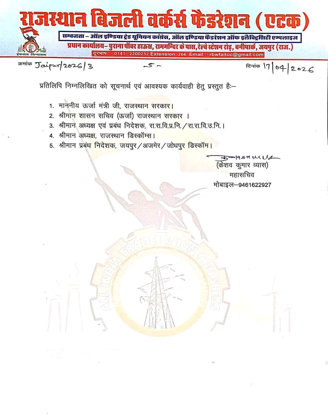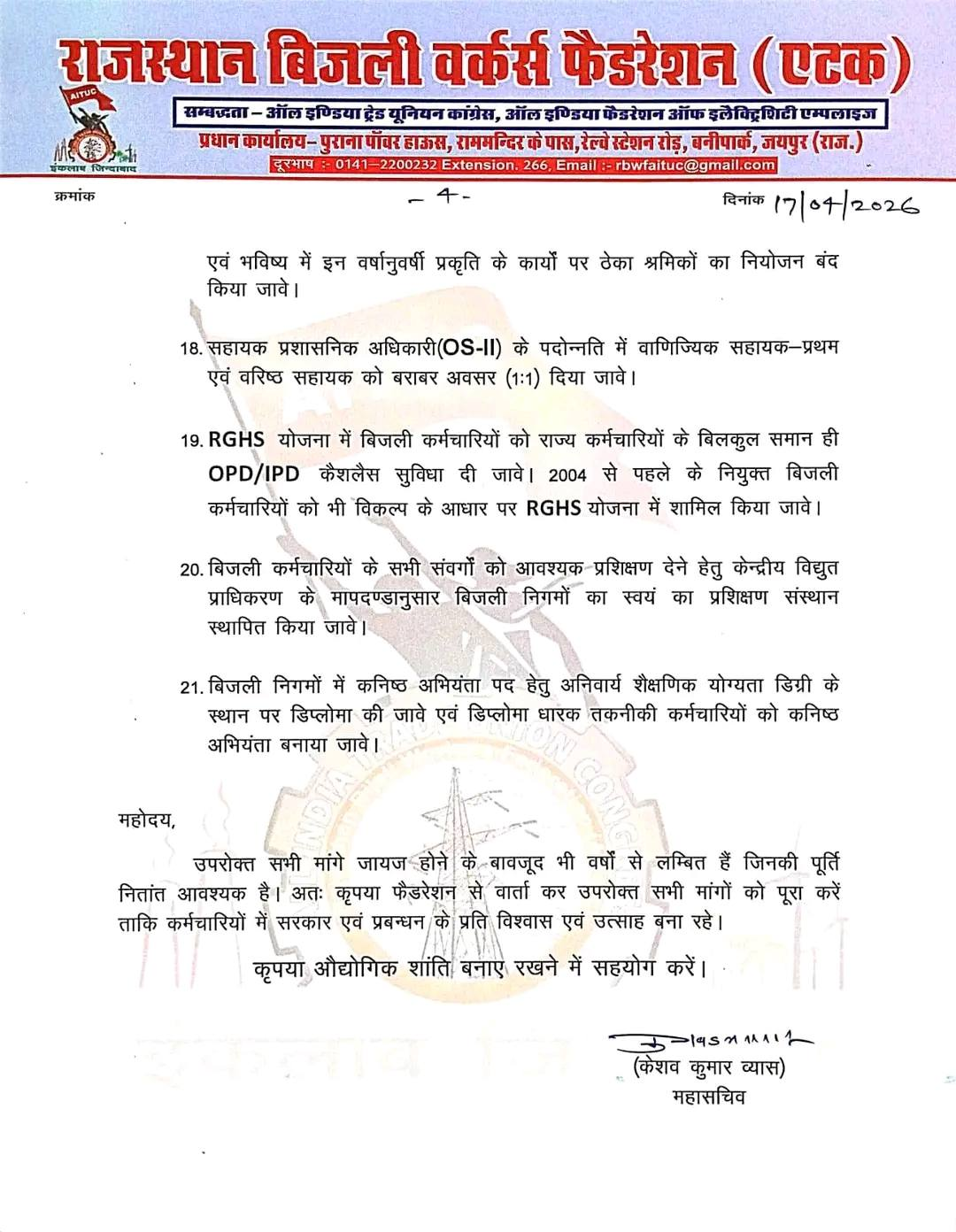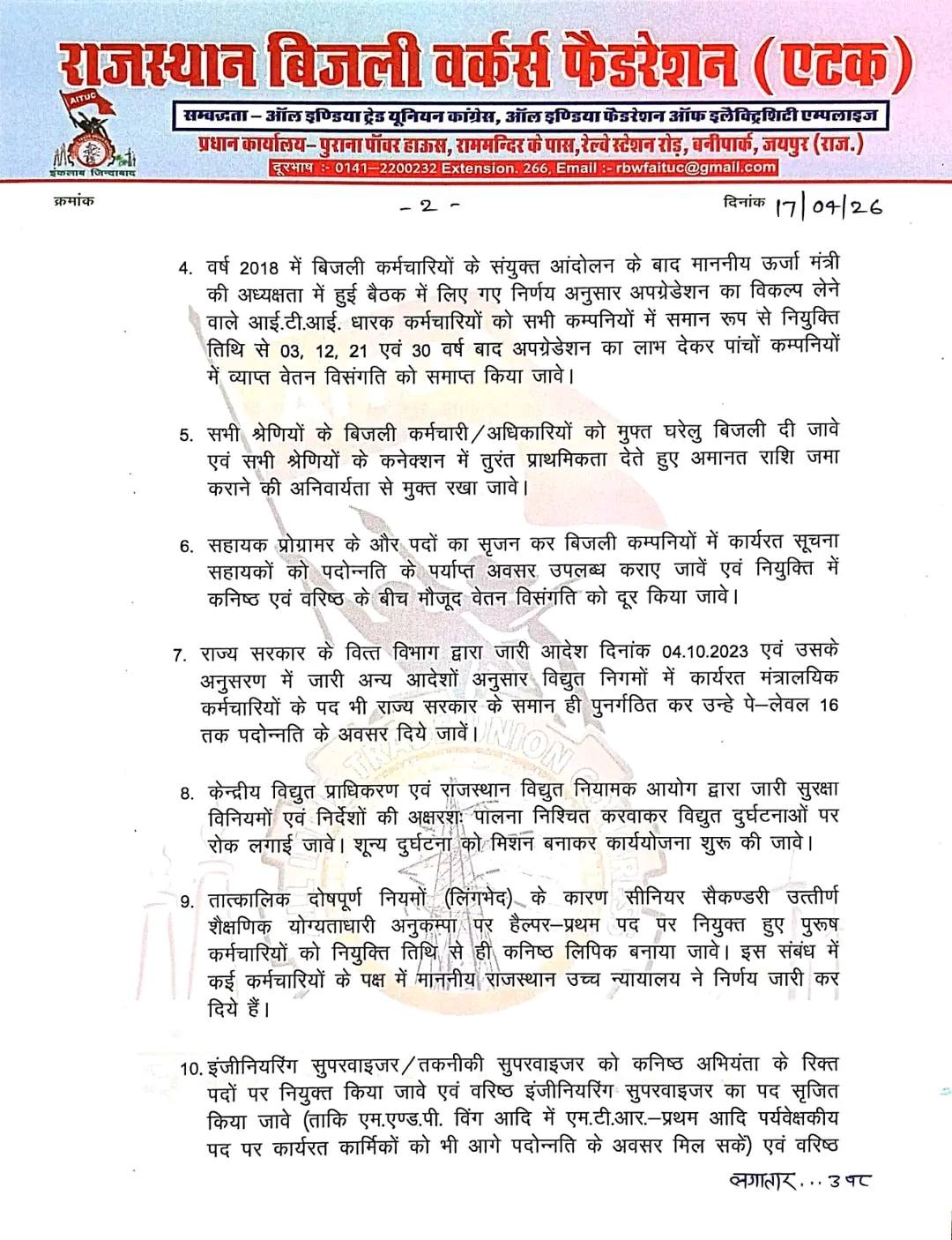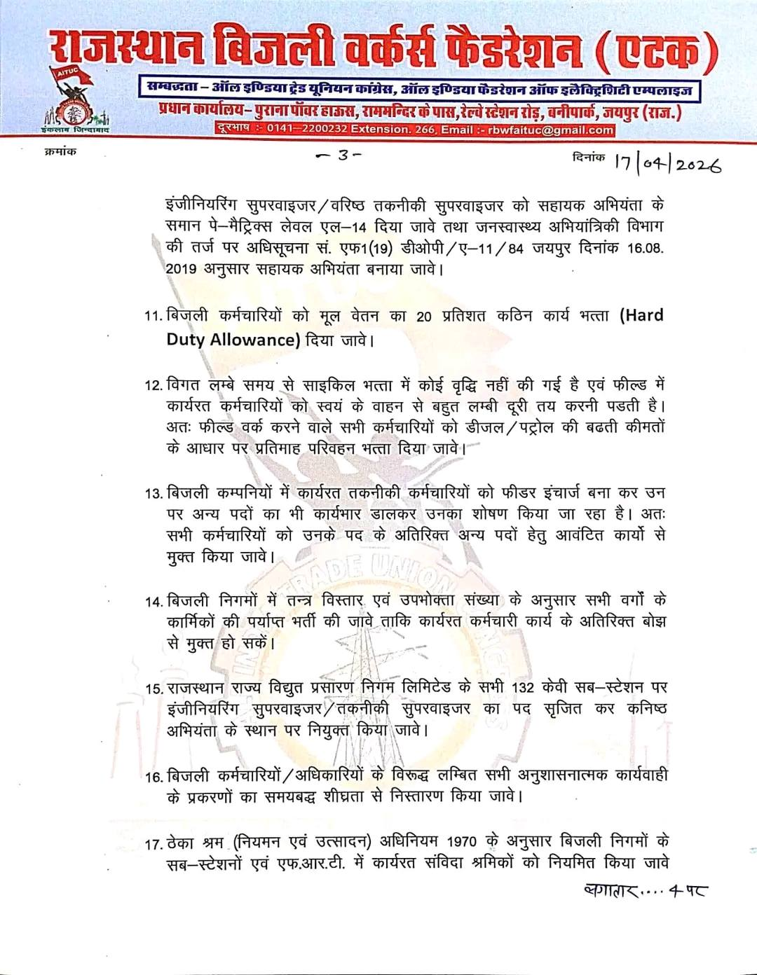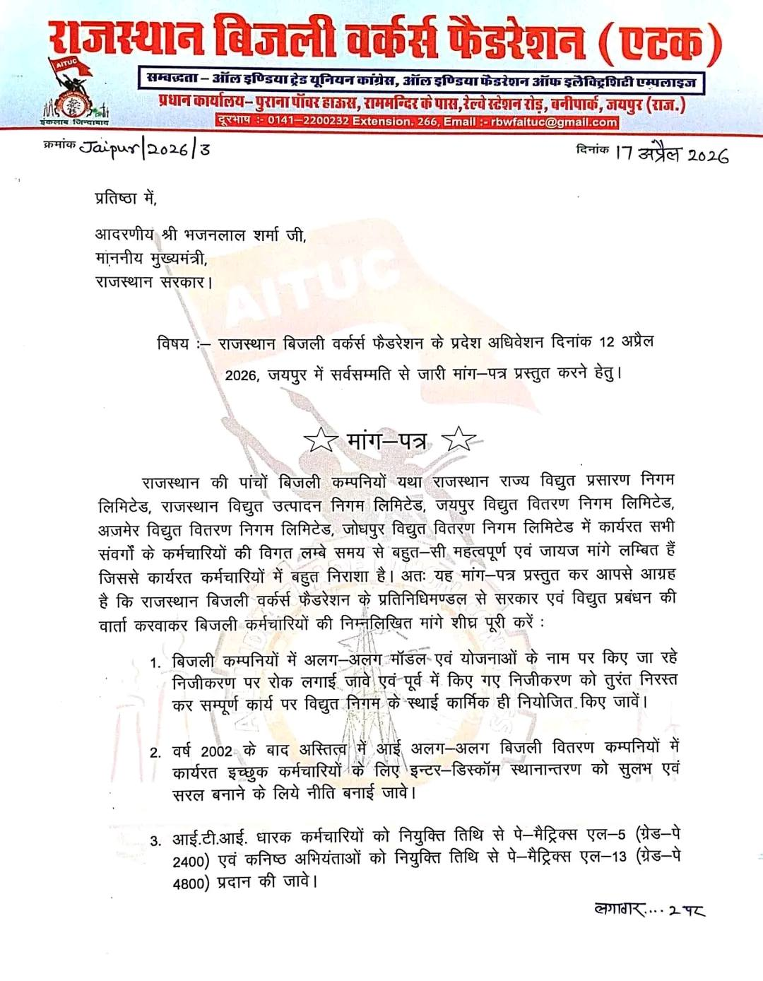 राजस्थान के बिजली कर्मचारियों ने अलग अलग मॉडल एवं योजनाओं के नाम पर किए जा रहे निनिकरण को रोकने और पूर्व में किए गए निजीकरण को तुरंत निरस्त कर सम्पूर्ण कार्य पर विद्युत निगम के कर्मियों को नियोजित करने की माँग सहित अपना 21 सूत्री माँग पत्र पेश किया।