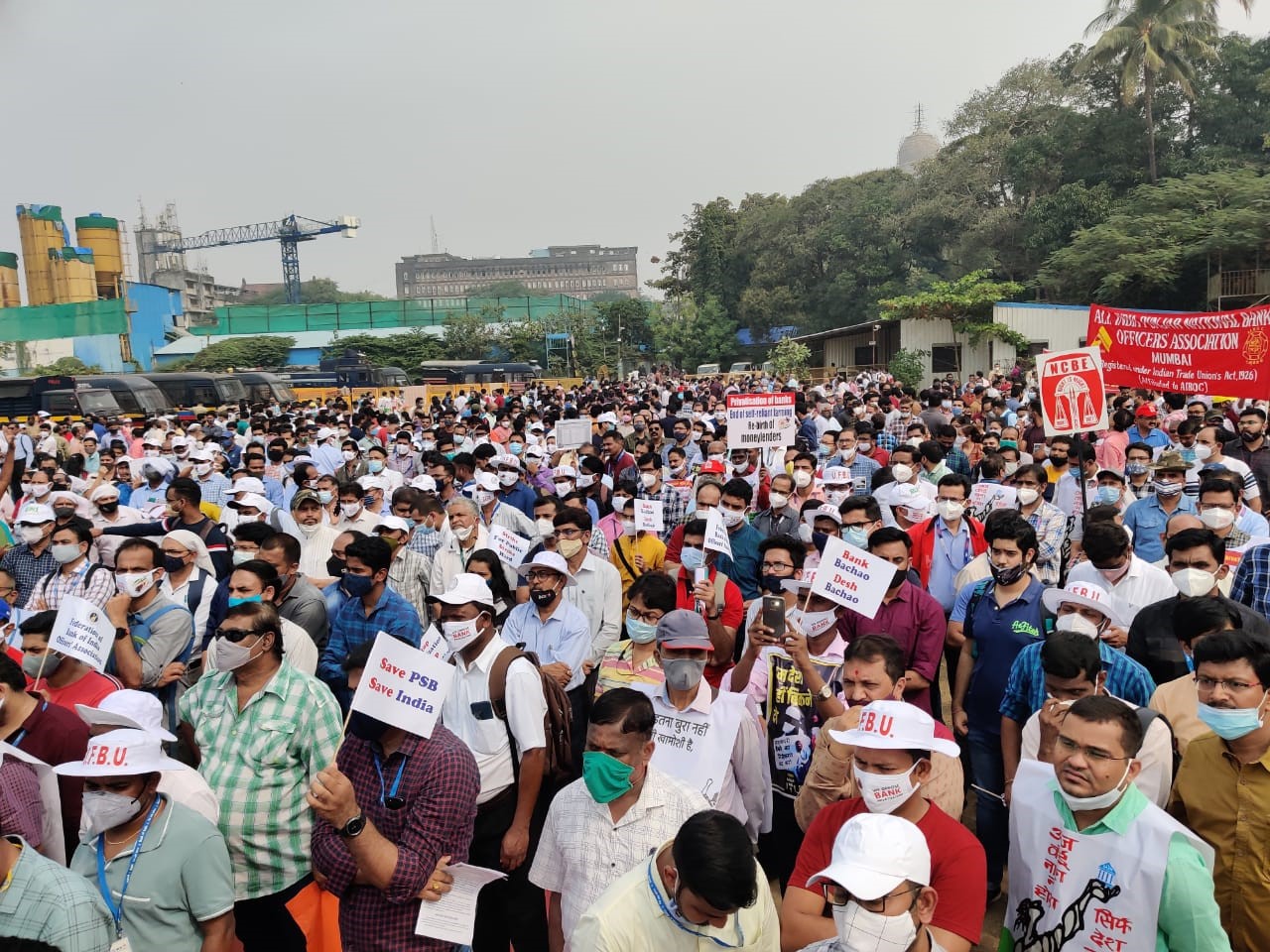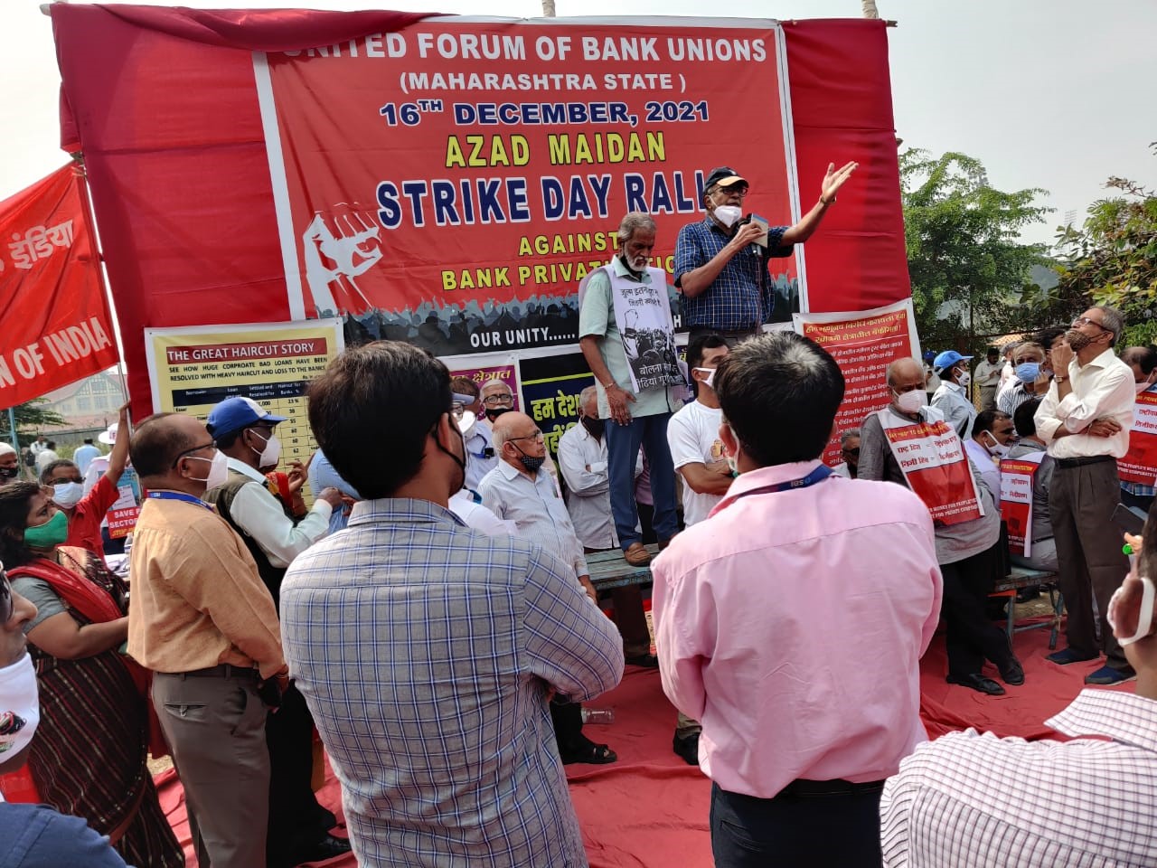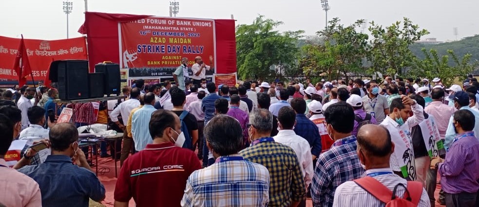 मुंबई के आजाद मैदान में सार्वजनिक क्षेत्र की बैंकों के निजीकरण के ख़िलाफ हड़ताल के पहले दिन,16 दिसंबर को बैंक कर्मचारियों की रैली