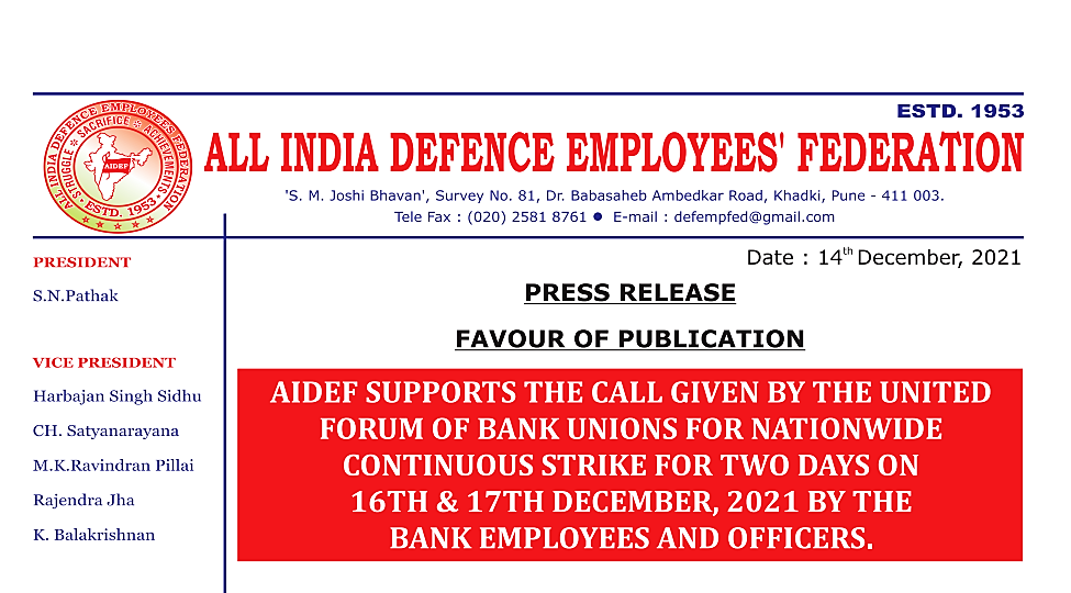 AIDEF यूनाइटेड राष्ट्रव्यापी बैंक यूनियनों का मंच के द्वारा दिए गए बैंक कर्मचारियों और अधिकारियों के द्वारा 16 और 17 दिसंबर, 2021 को लगातार दो दिवसीय हड़ताल का समर्थन करता है।