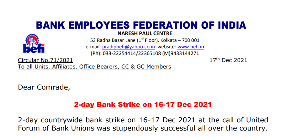यूनाइटेड फोरम ऑफ बैंक यूनियंस के आह्वान पर 16-17 दिसंबर 2021 को 2 दिवसीय देशव्यापी बैंक हड़ताल पूरे देश में आश्चर्यजनक रूप से सफल रही।