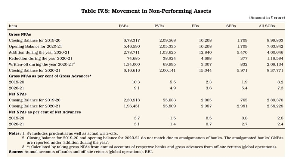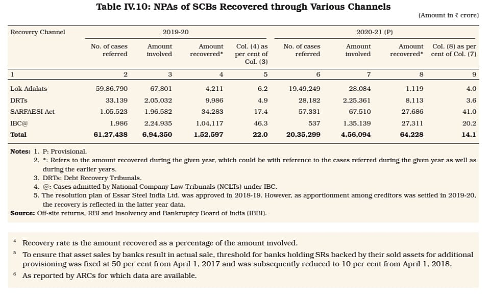 आरबीआई द्वारा दी गई तालिका IV.10 विभिन्न तरीकों से एनपीए में वसूली से संबंधित है जो दर्शाती है कि वसूली की दर 22% से घटकर 14.1% हो गई है और उसके भीतर, आईबीसी, लोक अदालत, डीआरटी के माध्यम से वसूली दर कम हो गई है जबकि सरफेसी अधिनियम से वसूली दर बढ़ गयी है। यह सब वसूली किस तरीके से हुई है, यह पता नहीं है।